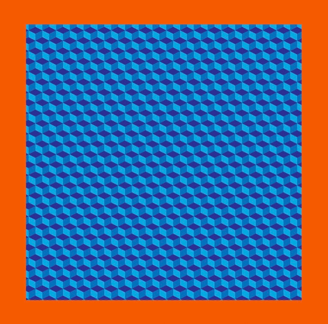 The Alici is an eye catching, two toned blue geometric patterned silk scarf with a vibrant orange border